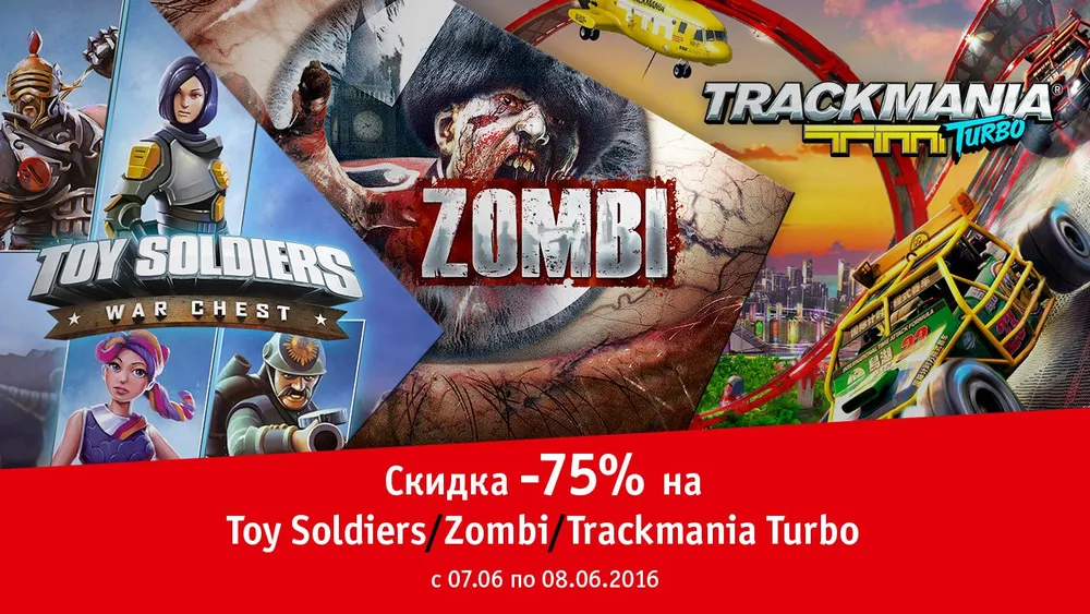 Только два дня (с 7 по 8 июня) и только в нашем цифровом магазине вы можете приобрести три абсолютно непохожих друг на друга PC-проекта от компании Ubisoft со скидкой 75%! Зачем ждать какую-то распродажу в Steam, если уже сейчас можно взять себе в коллекцию мрачный зомби-боевик Zombi (299 руб.), стратегию в реальном времени Toy Soldiers: War Chest (199 руб.) и гоночную аркаду Trackmania Turbo (299 руб.) по столь сочным ценам?! Верно, незачем :) Торопитесь, предложение сильно ограничено.
