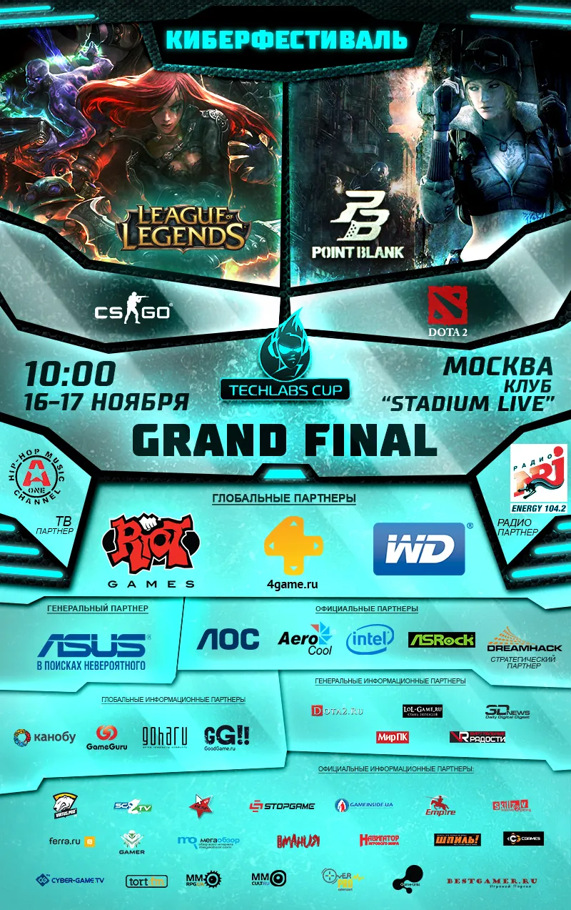 Киберфестиваль TECHLABS CUP CIS 2013 – Grand Final пройдет 16-17 ноября в Stadium Live – Москва. Вход платный. Информацию о стоимости и точках продажи билетов можно узнать на официальной странице чемпионата – www.cybersport.techlabs.pro. Расписание Гранд-финала и формат проведения чемпионата будут анонсированы 4 ноября.
