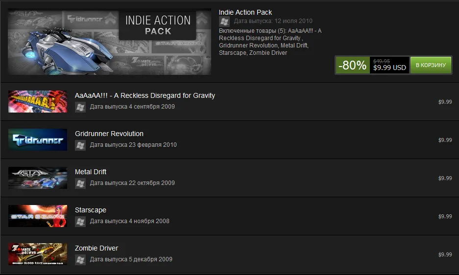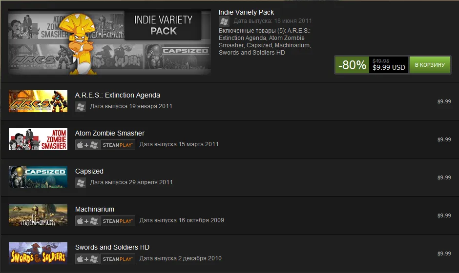 В Steam проходит акция. Один пак (5 игр) по цене одной игры, т.е. 9.99$. Всего два пака:
