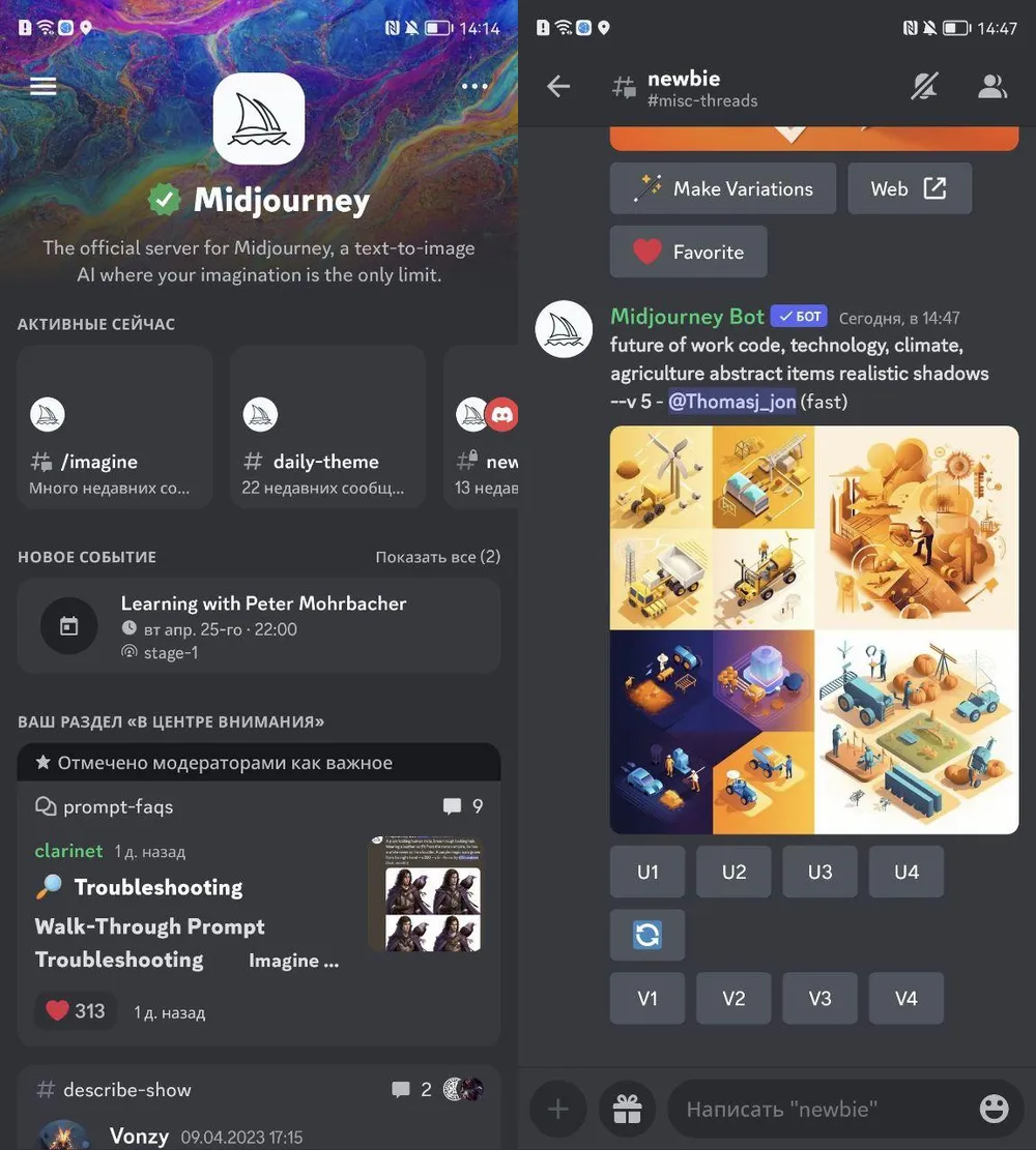 Midjourney — это популярная нейросеть, работающая на базе Discord. Чтобы использовать нейросеть, вам нужно присоединиться к одноименному серверу. В одном из каналов сервера есть подробная инструкция, как пользоваться нейросетью. Вы можете генерировать картинки либо на самом сервере, либо создать свой собственный, пригласив туда бота Midjourney. Обратите внимание, что бесплатная версия позволяет сделать только 25 запросов. Тем не менее, в интернете существует множество статей о том, как обойти этот лимит.