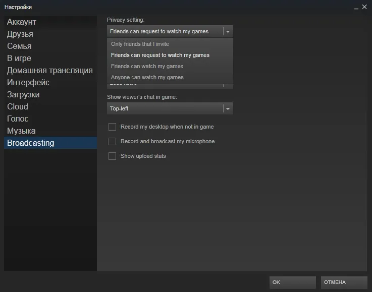 2. После этого в "Privacy Settings" спокойно выбирайте кому будет доступен просмотр вашей трансляции игры.