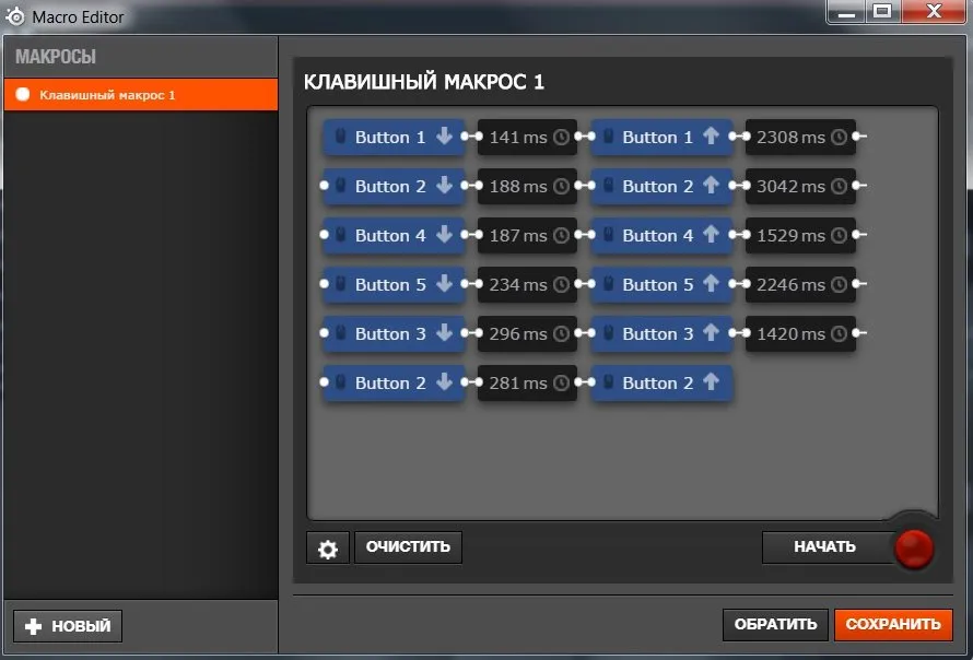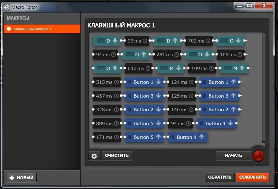 Редактор макросов после начала записи воспринимает команды мыши и клавиатуры, запоминает их последовательно, с учетом временных промежутков. Запись можно редактировать и сохранять под необходимым названием.