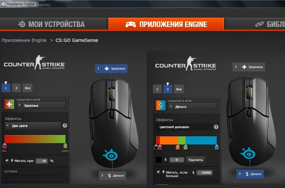 В приложениях Engine можно привязать световую индикацию мыши к некоторым событиям отдельных игр.