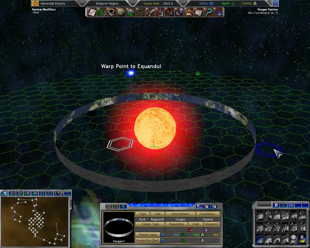 Величайшие умы нашей империи смогли разработать устройство, которое способно создать сферический мир. Для его работы требуется огромное количество ресурсов, но выгода от его использования очевидна. Созданный мир будет домом для 64 млрд. граждан и сможет вместить 200000 кт построек. Идеальное место для великого перенаселения.