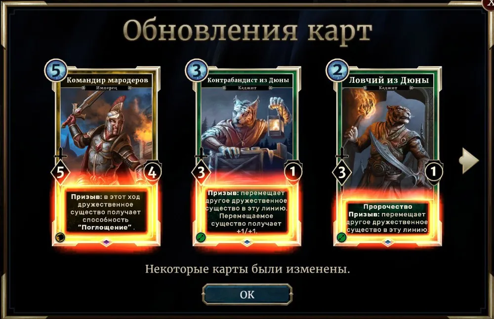 Две линии в The Elder Scrolls: Legends дают фантастические возможности геймплея, и эти карты – великолепный пример, как пользоваться такими стратегическими возможностями. Безнаказанно ускользать от вражеских существ – это круто, но каджиты из Дюны делают это слишком хорошо! Бывает очень неприятно, когда противник полностью связал ваше существо, хотя его существа при этом скопились на другой линии. Недовольство этой моделью игры, в сочетании с высоким уровнем силы «Контрабандиста из Дюны», побудили нас внести это изменение.