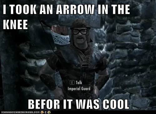 В любом поселении городские стражники при приближении к ним Главного Героя, произносят фразу: "Я тоже был авантюристом как ты, пока не получил стрелу в колено". Вероятно, если бы не ошибка геймдизайнеров, то на фразу бы не обратили внимания. Звездный час наступил в ноябре прошлого года,