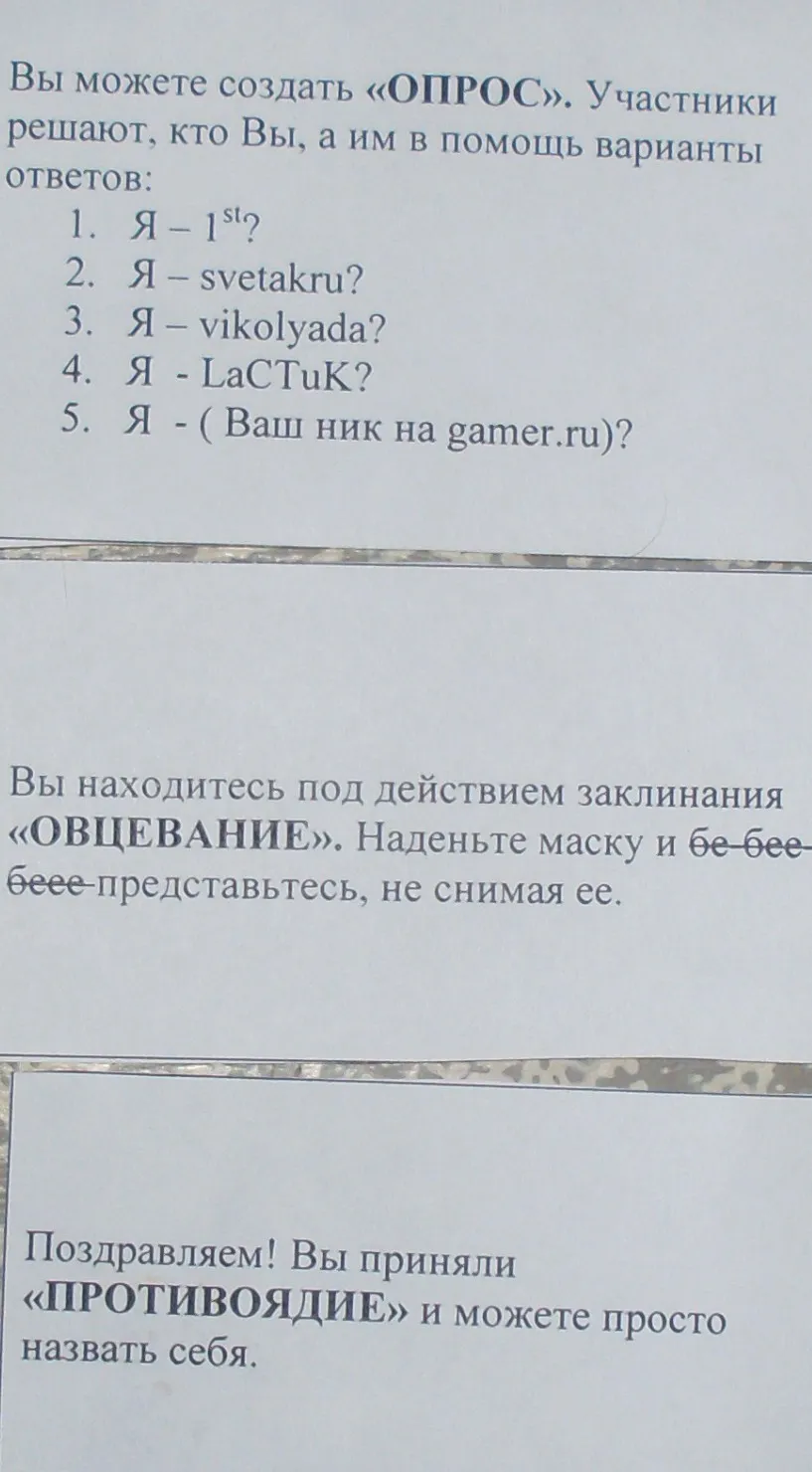 Началось все с того, что нас попросили представится. Для этого нам раздали бумажки, на которых были написаны заклинания Гамер.ру(на каждой бумажке по одному). Получив свои заклинания, мы должны были представится в стиле этих заклинаний.