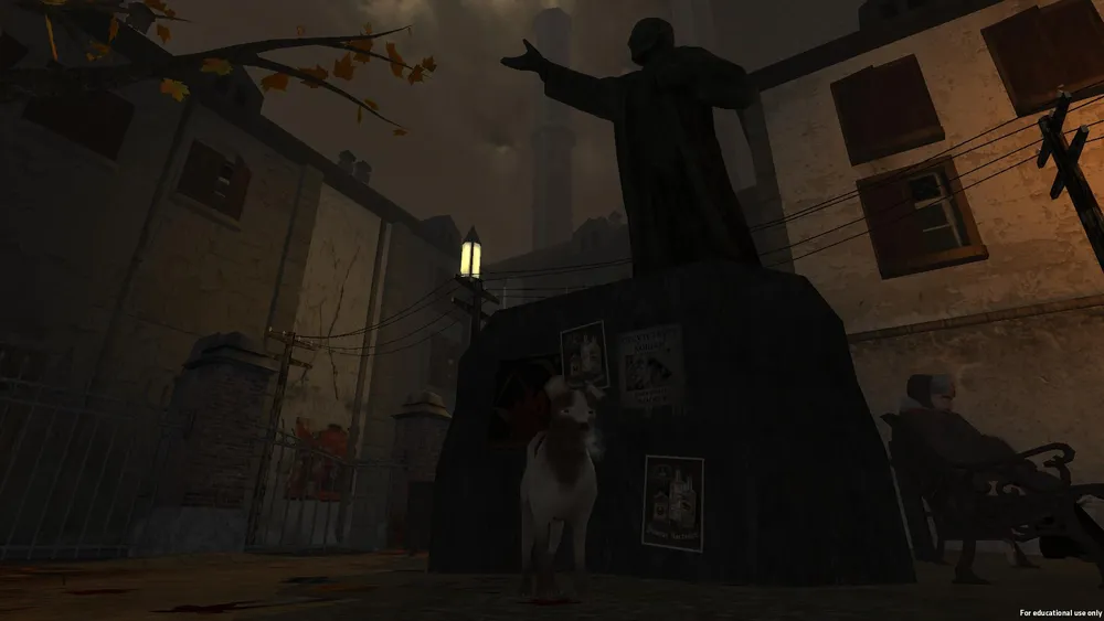 Капиталисты капиталистами, а собачку все-таки жалко. В качестве подопытной разработчики выбрали несчастную Кудрявку, которой выпала честь пережить зиму на улицах Столицы Родины Нашей. Оказывается, переулочки московские мало чем отличаются от подземелий Скайрима – безлюдные, промерзшие насквозь и крайне недружелюбные. Первая рожа, которую мы видим вместе с Кудрявкой – каменная. Владелец ее, чьей фамилией поражены тысячи улиц по всей России, протягивает руку в светлое будущее, пока мы остаемся в темных задворках соцреализма. Надо отдать варягам должное – они не постеснялись украсить стены агитлистовками и бредовыми плакатами. Они приправили скучную Первопрестольную отборной клюквой, которой позавидуют режиссеры фильмов про «красную угрозу». Пришла на наш зов яussia-matoushka…