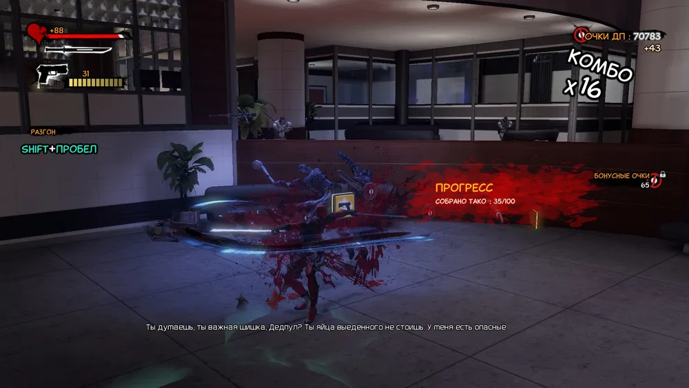 Вот так вот разработчики из High Moon погнались за двумя зайцами, обоих поймали, но один, зараза, оказался болезненным да и помер, заодно и второго заразив, посему тот тоже, к сожалению, сдох. Такая вот глубокая метафора отражает геймплейную суть Deadpoolа, но, ведь все же знают какой козырь припрятан у игры и о нем сейчас и поговорим. Помните, я говорил, будто Дэдпул сумасшедший? В общем, я солгал – он, к чертовой матери, чокнутый и даже больше.