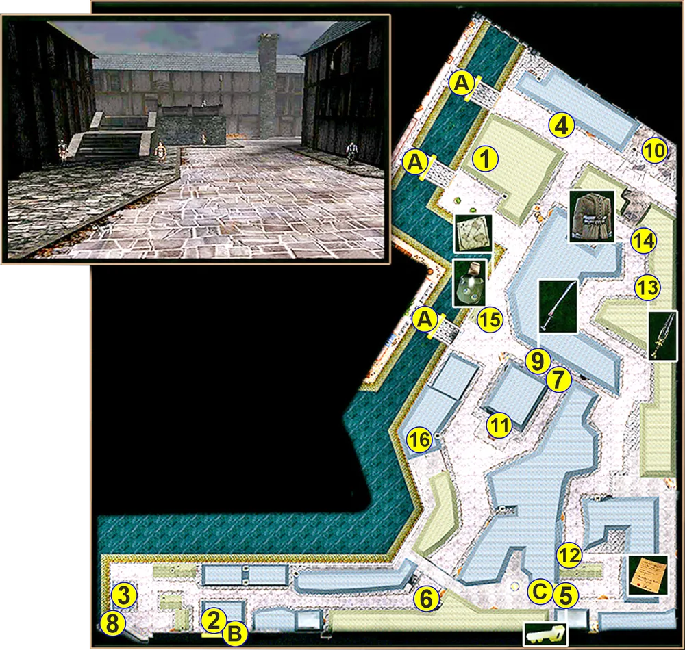 А - переход на рыночную площадь. В - переход в канализацию. С - переход в убежище Танкреда. 1 - торговец (доспехи). 2 - Мерден. 3 - оренианский торговец (кольцо, ожерелье; после получения кольца света торговец исчезает). 4 - торговец Таннер (доспехи). 5 - Старвус. 6 - шулер Ивас. 7 - ростовщик Геббин. 8 - Педро. 9 - Варисса. 10 - Аравинд. 11 - Горбус. 12 - фальсификатор Дагис. 13 - мясник. 14 - слепой нищий. 15 - аптекарь. 16 - торговец (зелья).