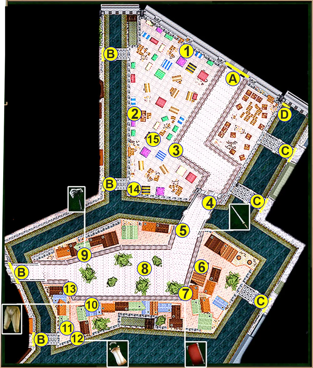А - переход на рыночную площадь. В - переход в Портовый район. С - переход в старый город. D - переход в акведук. В НАЧАЛЕ ИГРЫ: 1- лебедки, открывающая ворота (а1 или b1), (а2), (а3). 2 - лебедка, открывающая ворота (с2). 3 - лебедки, открывающие ворота (а1 и b1), (с1), (с3). 4 - Керваль. 5 - ключ от канализации. 6 - кусок соли. 7 - зеленый осколок гимаади. 8 - кольцо-печатка. 9 - тряпичная кукла. 10 - ослепляющий щит. ПОСЛЕ ЗАХВАТА ЛЕНЕЛЕ: 11 - медальон ночи. ПОСЛЕ ВОЗВРАЩЕНИЯ ИЗ ОРЕНИИ: 12 - страница 4. 13 - резьба Дехилоса. 14 - охотничий горн. 15 - аллигатор. 16 - боевые рукавицы Желание дракона. 17 - боевые рукавицы героя.