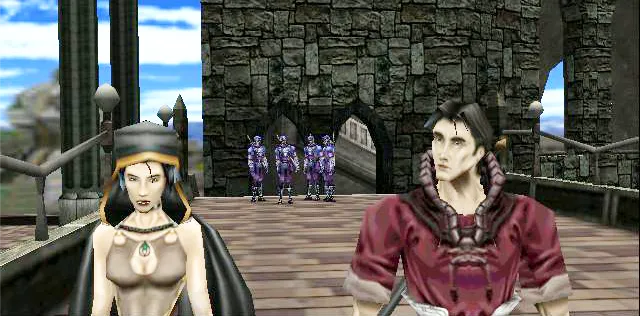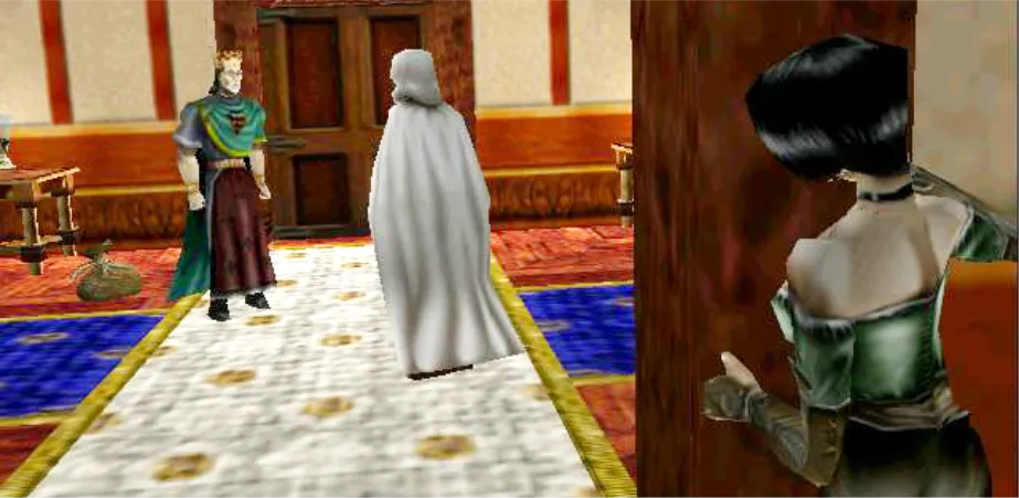 Из акведука вы сможете перейти во дворец. Как только вы окажетесь в нем, с вами заговорит Флис (см. ниже 2.5. Ленеле, Портовый район: амулет принца Йона). На третьем этаже дворца вы обнаружите, что дверь комнаты Яго заперта. Как ни странно, вы сможете поговорить с ним и через запертую дверь, продолжив развитие сюжета, но это будет не комильфо. Логичней забрать ключ от комнаты Яго из королевских покоев, где он хранится. Когда вы приблизитесь к королевским покоям, начнется скриптовая сцена, в которой король разговаривает с Аоки (см. рисунок ниже), а Флис подслушивает этот разговор.