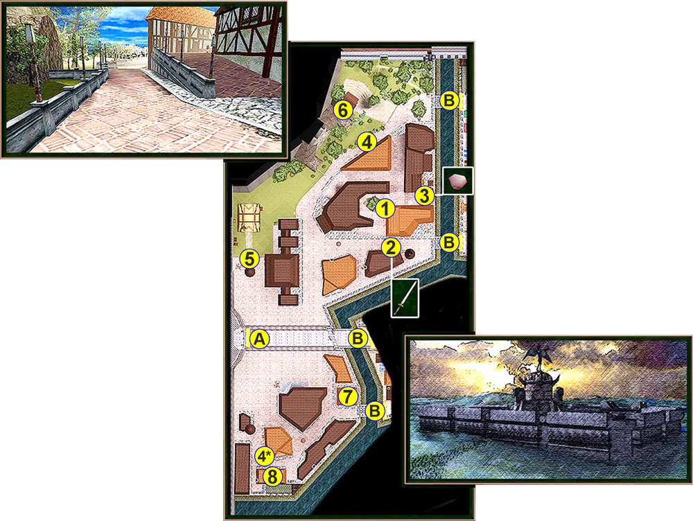 А - переход к Храмовой площади. В - переход на рыночную площадь. 1 - торговец (драгоценные камни, кольцо мечника, благословенное ожерелье). 2 - Помпоро. 3 - Зефнат. 4 или 4* - ювелир Торрас. 5 - крысолов Хумбус. 6 - театр. 7 - торговец (доспехи). 8 - торговец (зелья, доспехи).