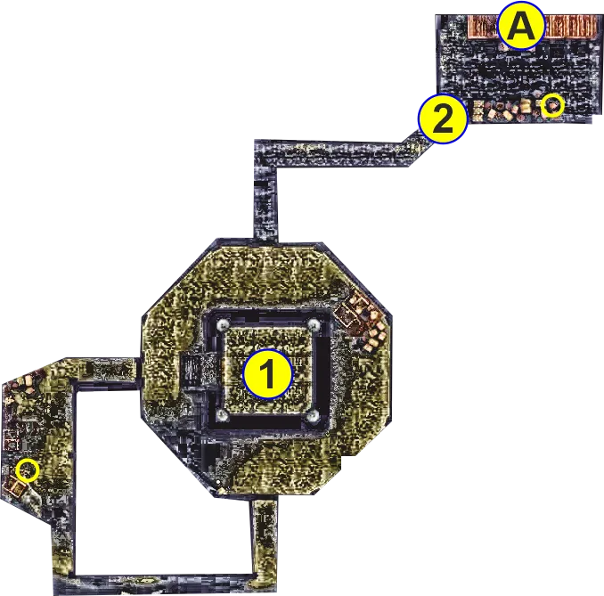 1 - начало миссии. 2 - потайная дверь. А - переход на первый этаж. Окружностями показаны контейнеры (аметист, микстура исцеления).