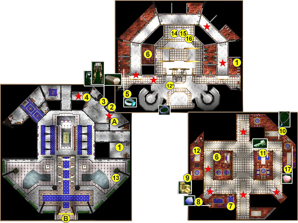А - переход в подвал. В - переход на дворцовую площадь. НАЧАЛО ИГРЫ: 1 - винтовая лестница. 2 - Эро. 3 - Панеф. 4 - потайная дверь. 5 - кольцо лучника (+1 луки). 6 - лестница между вторым и третьим этажами. 7 - трактат Огненная стрела. 8 - аметист. 9 - 500 монет (в секретере). 10 - амулет принца Йона. 11 - ключ от покоев Яго. 12 и 12*- Яго. ПОСЛЕ ПОЛУЧЕНИЯ КОЛЬЦА СВЕТА: 13 - распорядитель пиров. 14 - король Беллиз. 15 - королева Галиенн. 16 - принц Сорнехан. 17 - гранат. Звездами показаны стражники.