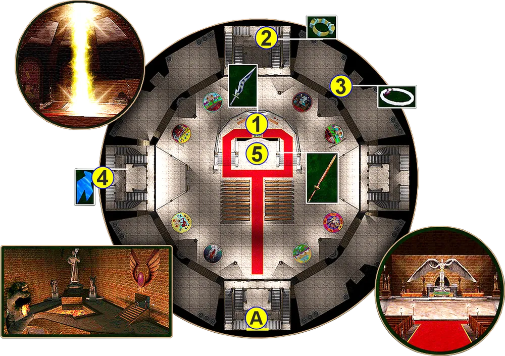 А - переход на Храмовую площадь. 1 - иерофант. 2 - Джерв. 3 - Амас. 4 - синий осколок гимаади. 5 - злой Урат (появится в конце игры).