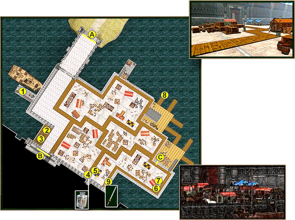 А - выход на карту мира. В - переход на рыночную площадь. С - переход в канализацию. 1 - Дурган. 2 - торговец (щит, эликсиры). 3 - Великий Рагнелли. 4 - Билон. 5 - безумный Ивен. 6 - торговец (оружие). 7 - Дрего. 8 - мучавийский капитан. 9 - рыбная палатка.