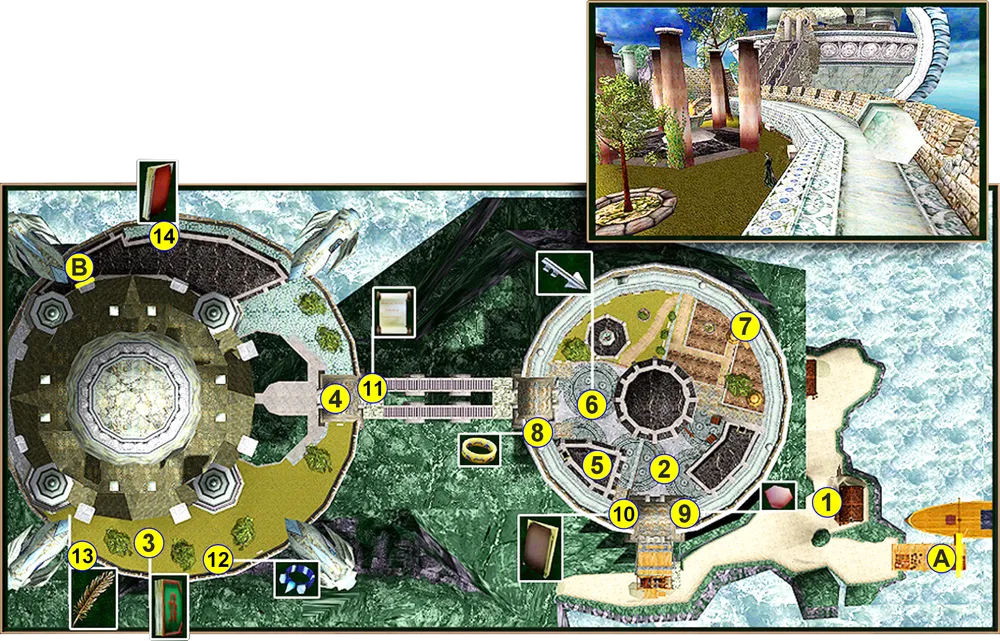 А - переход на карту мира. В - переход в катакомбы. 1 - торговец Эмма (оружие, эликсиры, свитки). 2 - брат Эамон. 3 - послушница Сама. 4 - брат Морхан. 5 - аббат Лаурент. 6 - брат Оваард. 7 - сестра Кела. 8 - сестра Лило. 9 - сестра Миала. 10 - монах. 11 - сестра Билан. 12 - брат Вид. 13 - перо Урата. 14 - том 67.