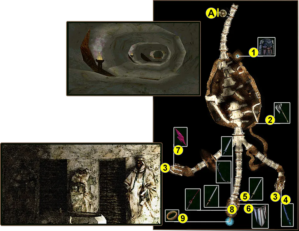 А - переход в монастырь. 1 - кольчужная туника. 2 - топор Айкуса. 3 - сфера на пьедестале. 4 - ледяной кинжал. 5 - костяной меч. 6 - щит Оплот упадка. 7 - красный осколок гимаади. 8 - Карадос. 9 - Кольцо света.