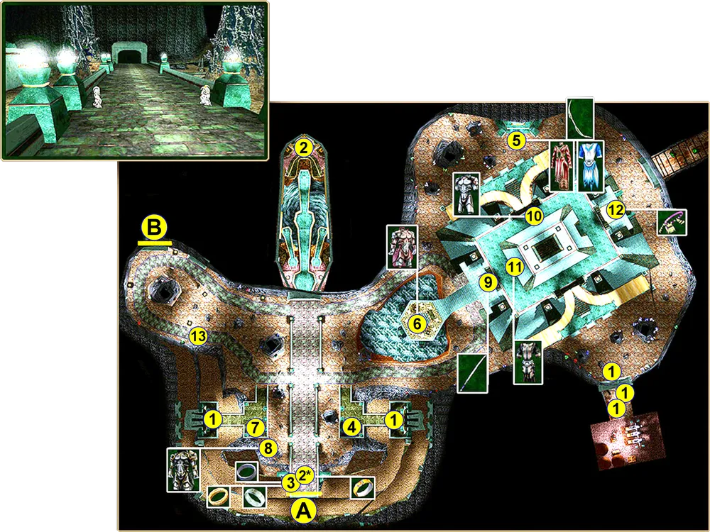 Перейдя во второе помещение (+1000 ехр), вам нужно будет нажать на кнопки, чтобы открылся проход в третьем помещении. Правильная последовательность нажатия указана на карте. Если нажать на кнопки неправильно, то появится один из четырех ониксовых големов, с которым придется сразиться. Отжимать неправильно нажатую кнопку не стоит, иначе появится очередной голем.