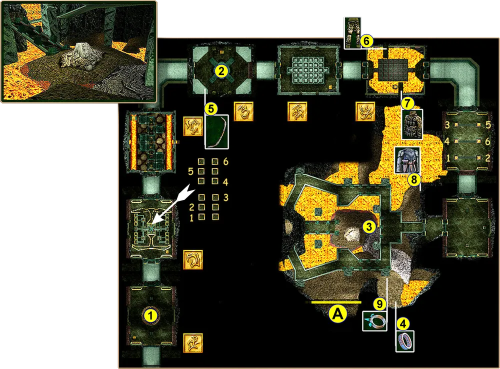 В седьмом помещении на полу находятся шесть золотых плиток с изображенными на них рунными числами. Необходимо в правильной последовательности нажать на них. Эта последовательность отображена на карте лабиринта. При неправильном нажатии в помещении появится один из стальных големов, с которым придется сразиться. Когда вы нажмете на плитки в правильной последовательности, откроется дверь на юге (+2000 ехр).