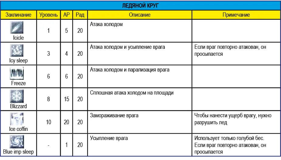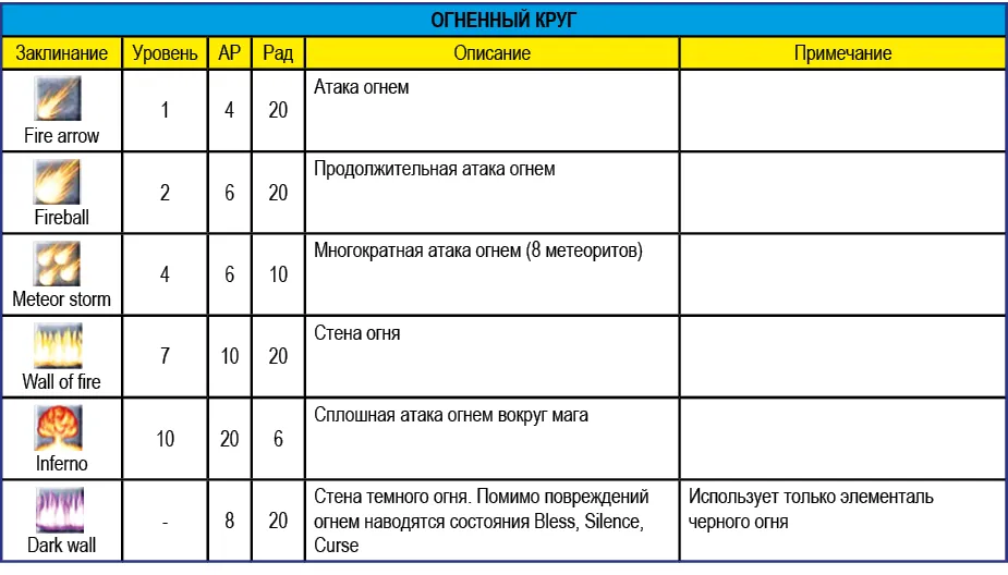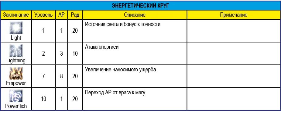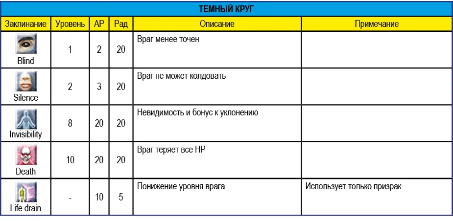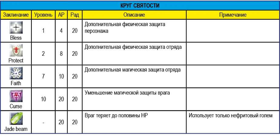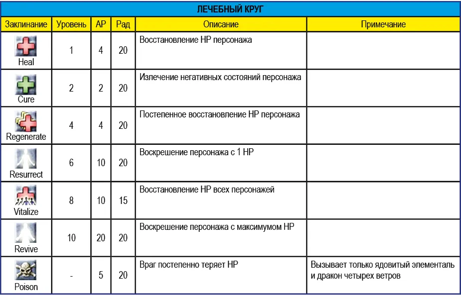 Приведенное в таблице ниже значение радиуса (Рад) означает максимальное расстояние действия заклинания. Например, заклинание Vitalize восстанавливает НР персонажей, которые находятся от заклинателя на расстоянии не более 15 метров.
