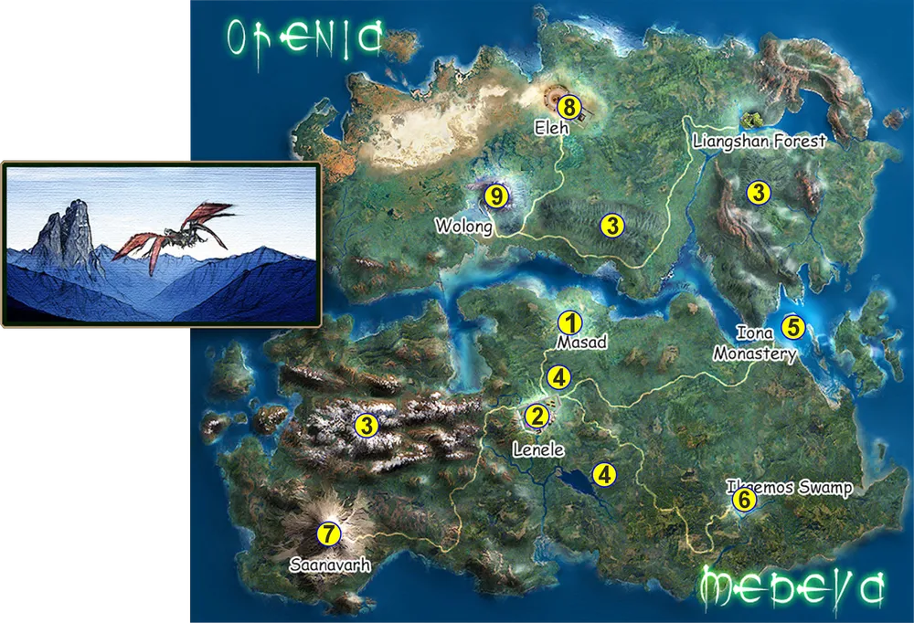 1 - Масад. 2 - Ленеле. 3 - холмы. 4 - луга. 5 - монастырь Ионы. 6 - болота Икаемоса. 7 - Саанавар. 8 - башня Элех. 9 - деревня Волонг.
