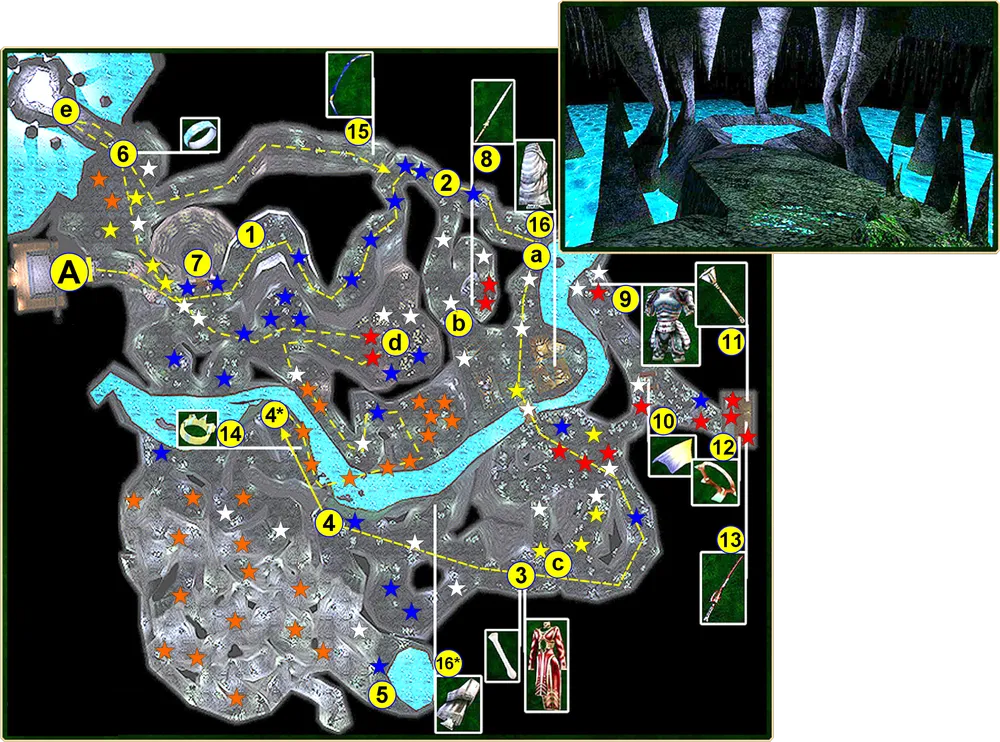 А - переход в Волонг. а - пилоны, наводящие проклятие. b - шипы замедления. с - управляемые шипы. d - Хвост Рокула. е - Пруд Чудес. 1 - Карис Проклятый. 2 - Дрезин Измучанный. 3 - Ажа. 4 - Бэйлис. 5 - Тианди. 6 - Нгару. 7 - призрак Нефритового храма. 8 - корогткий меч-бритва (урон 55; скорость 1,00; требуется навык Тяжелое оружие 3). 9 - броня Бугу-Ду (защита 35; скорость 1,11; защита от колющего оружия +2; требуется навык Тяжелое оружие +2; монут использовать Йосиф, Джекхар, Флис). 10 - чешуйка красного дракона. 11 - булава Пронзатель (урон 55; скорость 1,00; эффект: пиявка силы; требуются навыки Дробящее, Тяжелое оружие 5). 12 - медальон тени (+3 красться, +3 скрытность). 13 - меч косани. 14 - кольцо Фригидиса (+5 защита от холода). 15 - пробивающий лук (урон 40; скорость 1,43). 16 - правая и левая ноги статуи.