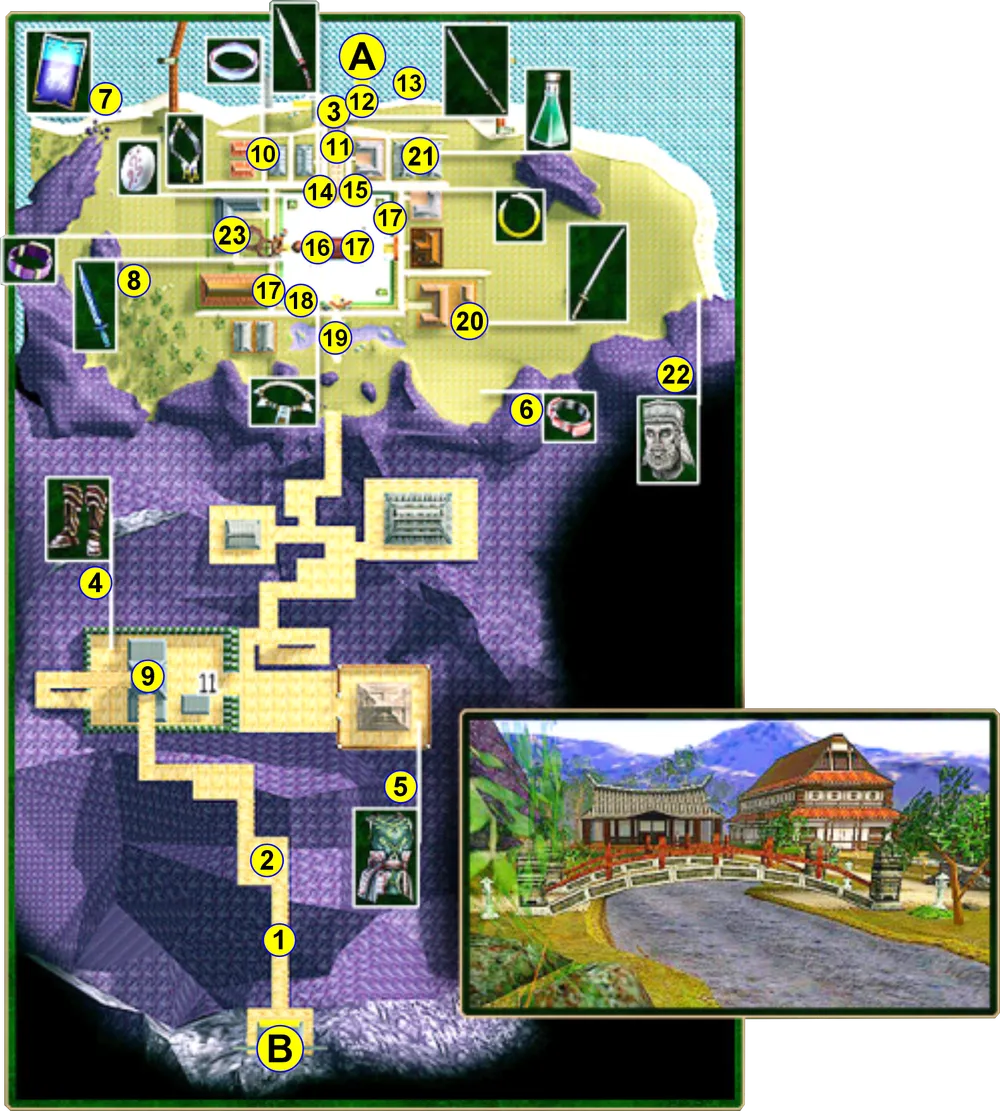 А - переход на карту мира. В - переход в пещеры Волонга. 1 - солдат Нефритового храма. 2 - жрец Нефритового храма. 3 - генерал Пиджин. 4 - боевые сапоги (защита 15; скорость 1,01; двойная атака +2; требуется навык Тяжелое оружие 5; может использовать Йосиф). 5 - кольчуга героя (защита 40; скорость 0,91; +10 действие; требуется навык Тяжелое оружие 5; может использовать Джекхар). 6 - кольцо умения (+25 единиц действия). 7 - римский щит (защита 20; скорость 0,91; уклонение +3; требуется навык Тяжелое оружие 3). 8 - кинжал льда (урон 30; скорость 1,33; эффект: сосулька). ПОСЛЕ ПОБЕДЫ НАД ГЕНЕРАЛОМ ПИДЖИНОМ: 9 - Аоки. 10 - Джекхар. ПОСЛЕ ВОЗВРАЩЕНИЯ С КАРТЫ МИРА: 11 - жрец Нефритового храма. 12 - Жимин. 13 - рыбак Руиди. 14 - Фенжин. 15 - Ликай. 16 - скульптор Каиши. 17 - торговец. 18 - Гулан. 19 - Хайди. 20 - Лонгюй. 21 - Нанди. 22 - голова статуи. 23 - Пиаобо.