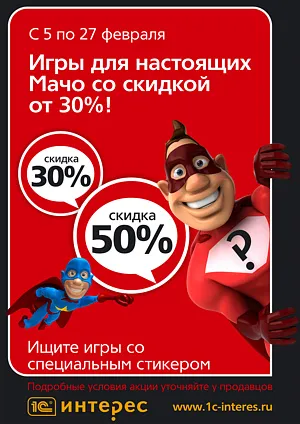 С 5 по 27 февраля включительно в сети магазинов «1С Интерес» будет проходить акция «Игры для настоящих Мачо». В рамках этой акции, при покупке компьютерных игр из списка, вы будете получать скидку 50%, а при покупке консольных игр из списка – скидку 30%. Ищите товары со специальными стикерами!