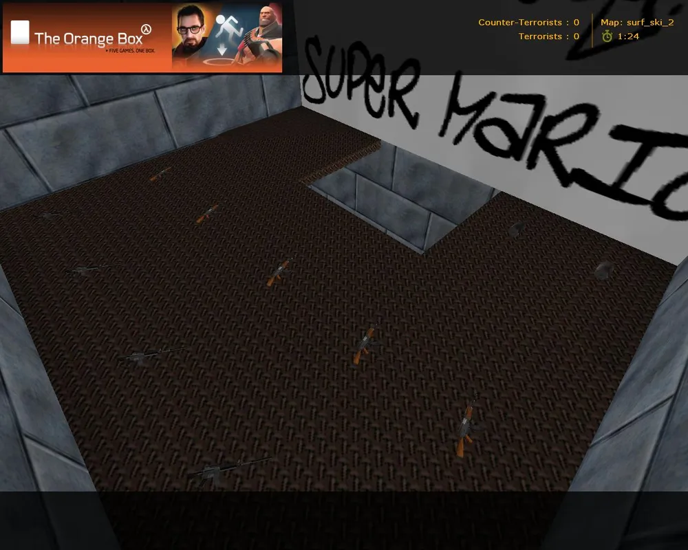 А теперь о карте... Вы начинаете с респауна у вас в руков пистолет (ну в общем как обычно) , но вот только закупиться нельзя =). Нужно залететь в комнату под названием "Marrio-room" там можно закупиться... Все обычно берут m3 так как это идеальное оружие для этой карты(у него нет разноса и на лету очень легко убить противника) Так же существует еще 1 комната которая называется "оружейкой" туда попасть намного проще! Там можно взять M4A1 или AK47 , так же существует большая вышка на которой лежат 2 awp но туда попасть гораздо труднее!