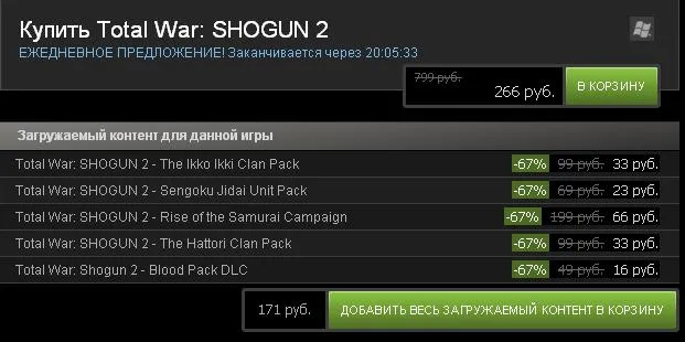Всем предложениям предложение!!! В течении суток (с 22-00 субботы, 17 декабря, до 22-00 воскресенья, 18 декабря) Shogun за 266 руб!!! У вас 20 часов, чтобы выполнить этот квест - купить оригинальный Сёгун, все DLC паки к нему и дополнение про новых Самураев, поцоны!!! ;)