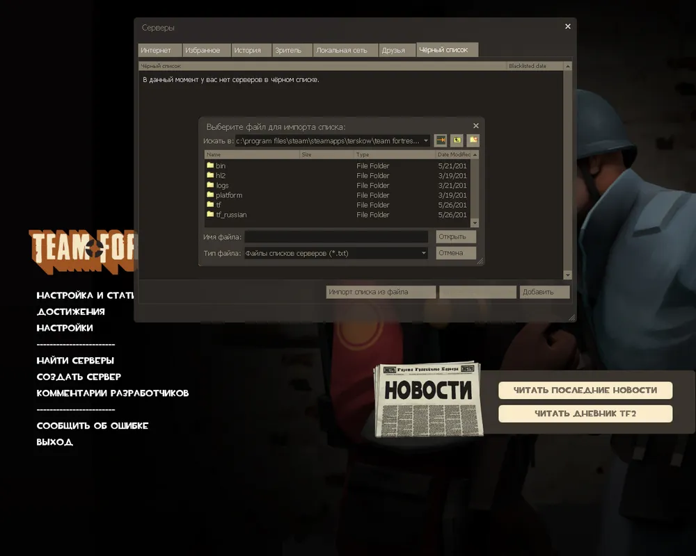 Так как сам Аксиома не спешит доделывать перевод, я решил поправить и дополнить его там и сям и поделиться с вами. Итак, в целом гигантская работа была проделана Аксиомой, мне лишь нужно было сделать название айтемов из свежего апдейта, также я решил поправить непереведённые диалоги сервер браузера про чёрный список и пару строчек в опциях. Чтобы было не так мелочно, перевёл газетёнку в меню и приложил поправленный шрифт tf2professor (при добавлении польских букв Valve случайно удалили русские, так что пришлось найти старую версию).