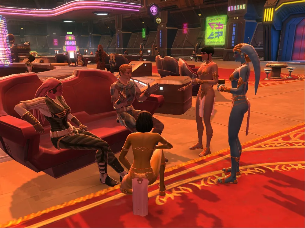 Доказательства (и результаты) видны отчетливо. Во-первых, озвучка всех NPC плюс уличного yadda-yadda — прекрасный способ освоить деньги: высокооплачиваемый ручной (горловой) труд, защищенный профсоюзами, плюс расходы на кастинг и т.п. Во-вторых, огромные локации с «классовыми» зонами одноразового использования (ущелье и пещера для контрабандистов на Татуине), с красивыми задниками и панорамами (особенно Алдераан). В-2.1, вся затея с холокронами теперь кажется средством увеличить объем локаций на десятки процентов. В-2.2, на локациях большое количество ненужных анимированных деталей, на которые игрок не обратит внимания (зайдите в кантину Slippery Slope(-s?) на Нар Шаддаа; посмотрите вверх — за каким-то чертом там еще несколько уровней, на которые попасть невозможно, но на втором (куда можно заглянуть краем глаза) танцуют голографические танцовщицы!).