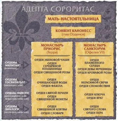 Адепта Сороритас- боевое структурное подразделение Адептус Министорум, полностью состоящее из женщин и поэтому известное как Сестринство. Его члены фанатичны в своей вере, малейшие проступки немедленно наказываются самым суровым образом. Состоящие полностью из женщин-воинов, подразделения Сестер Битвы посвящены защите Империума Человека от любой угрозы. Обучавшиеся от рождения и экипированные по самым высоким стандартам, эти верные слуги Экклезиархии сражаются вместе с другими Имперскими армиями или следуя пути собственных Войн Веры через всю галактику. Адепта Сороритас разделены на два отдела: Санкторум и Приорис. Первый находится во Дворце Экклезиарха на Земле, второй же - на Офелии IV. В каждом отделе есть собственные флоты и функционируют они подобно Орденам Космического Десанта. Возглавляет Санкторум Аббатиса Адепта Сороритас, духовная наставница всего Сестринства. Ей помогает командующая в ранге Приора. Приорис, в свою очередь, возглавляет Приор Офелии IV.
