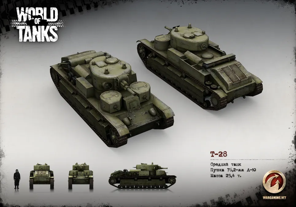 T-28 — трёхбашенный советский средний танк 1930-х годов. Первый в СССР средний танк, запущенный в массовое производство (выпущено более 500 шт.). Использовался в «Освободительном походе» на Западную Украину, Зимней войне и на начальном этапе Великой Отечественной. Теперь и в Мире Танков :)