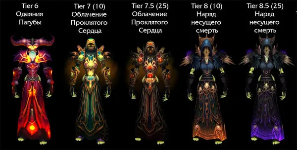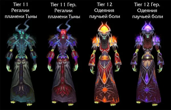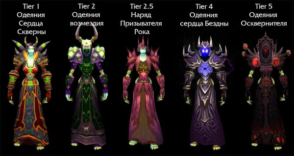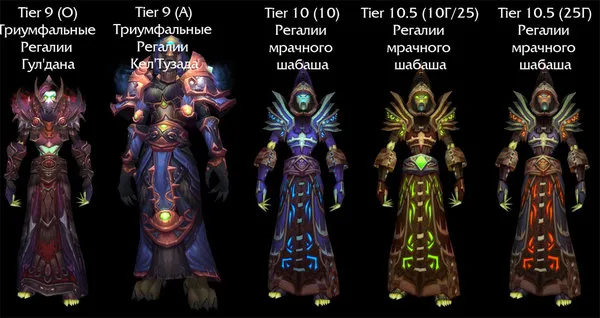 Этот комплект источает ауру древних богов. При его создании мы взяли за основу генерала Везакса из Ульдуара. Зловещие и мрачные доспехи прекрасно подходят для чернокнижников, и этот комплект не станет исключением.
