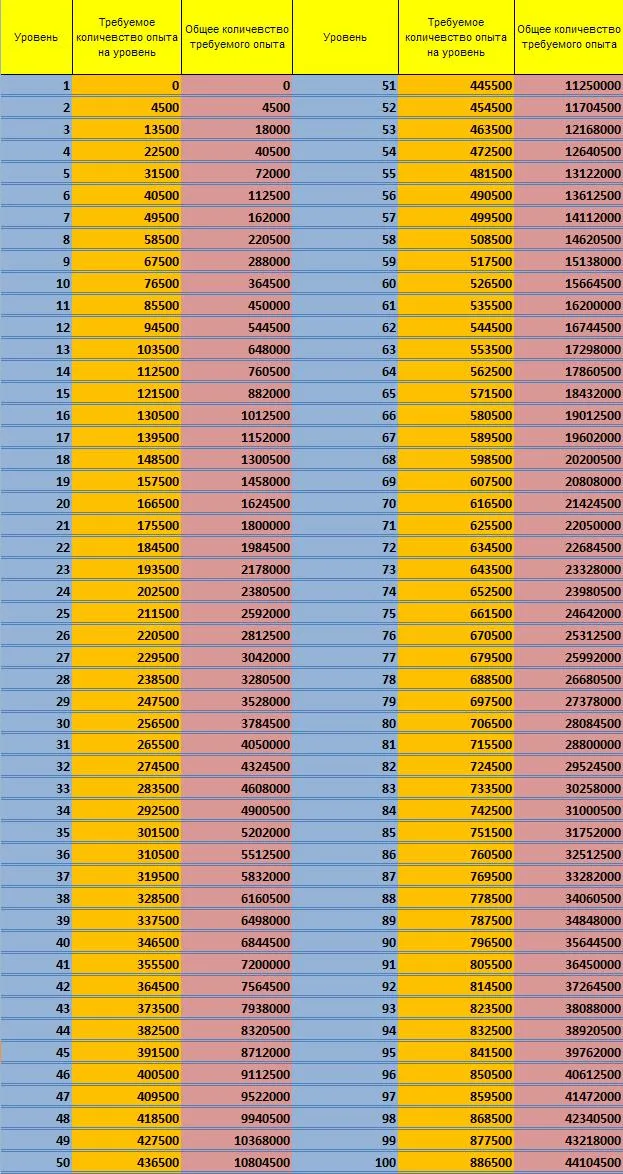 Таблица опыта