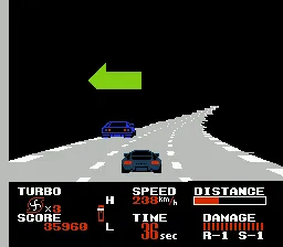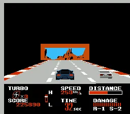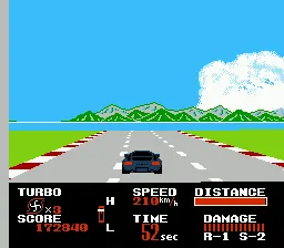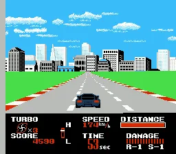Графика неплохая, трасса типична для Nes, есть туннели, которые довольно зрелищны, как минимум, если вы в первый раз в них въезжаете. Пускай и реализованы они по принципу черного квадрата – но, поверьте, в движении смотрятся хорошо и запоминаются! Ваше воображение может рисовать что-нибудь в духе обложкиRoad Blasters, футуристические пейзажи и чёрный автомобиль с рыцарем дороги за рулем, крепко сжимающим руль, чтобы поймать очередного маньяка удирающего по шоссе на запредельной скорости!
