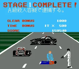 Наша цель – догнать и уничтожить преступника – врезаясь в него. Машина оппонента сначала загорится, а потом, остановится. Как только это случится – миссия пройдена. И мы увидим специальный экран – ареста преступника. На нем нам покажут неплохо нарисованную картинку – задник. По меркам Nes - считайте как заставку.
