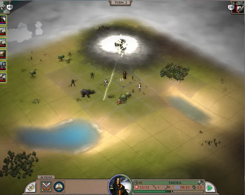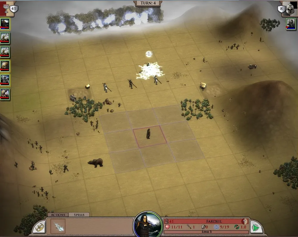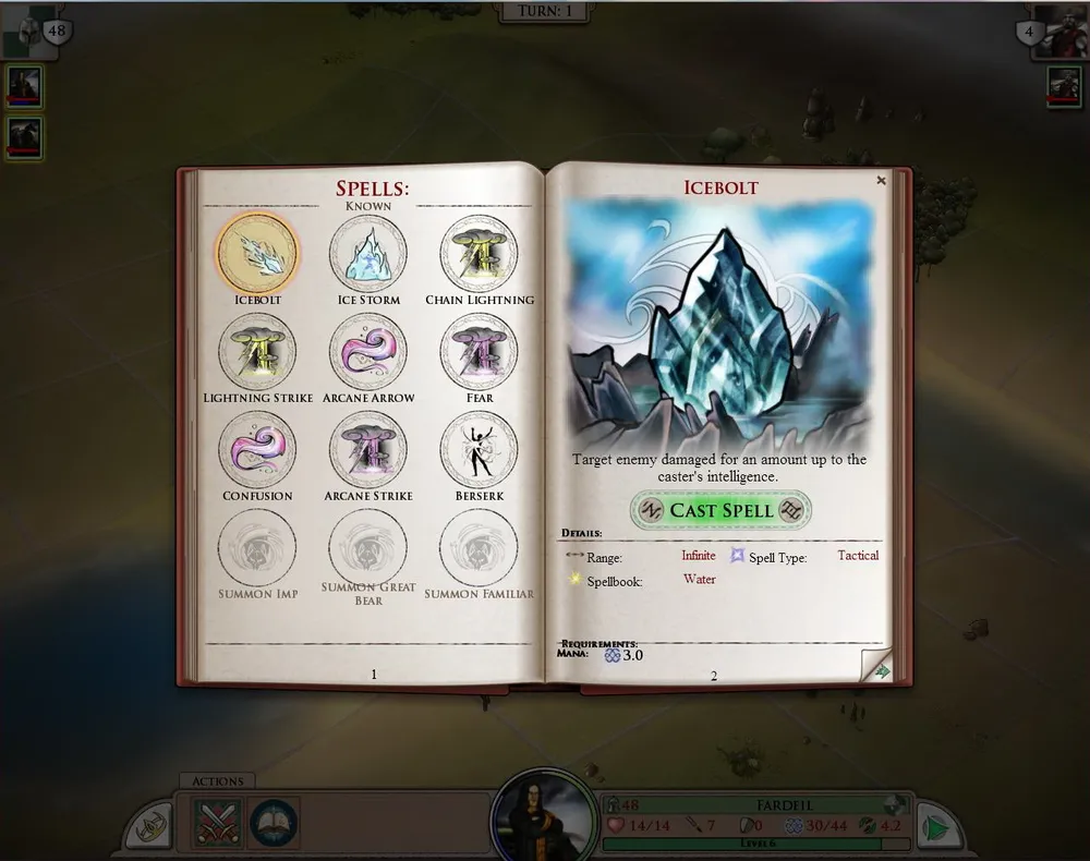 На тактической карте мы пока можем только ходить, бить и колдовать. Нажимаем книжку, она открывается: