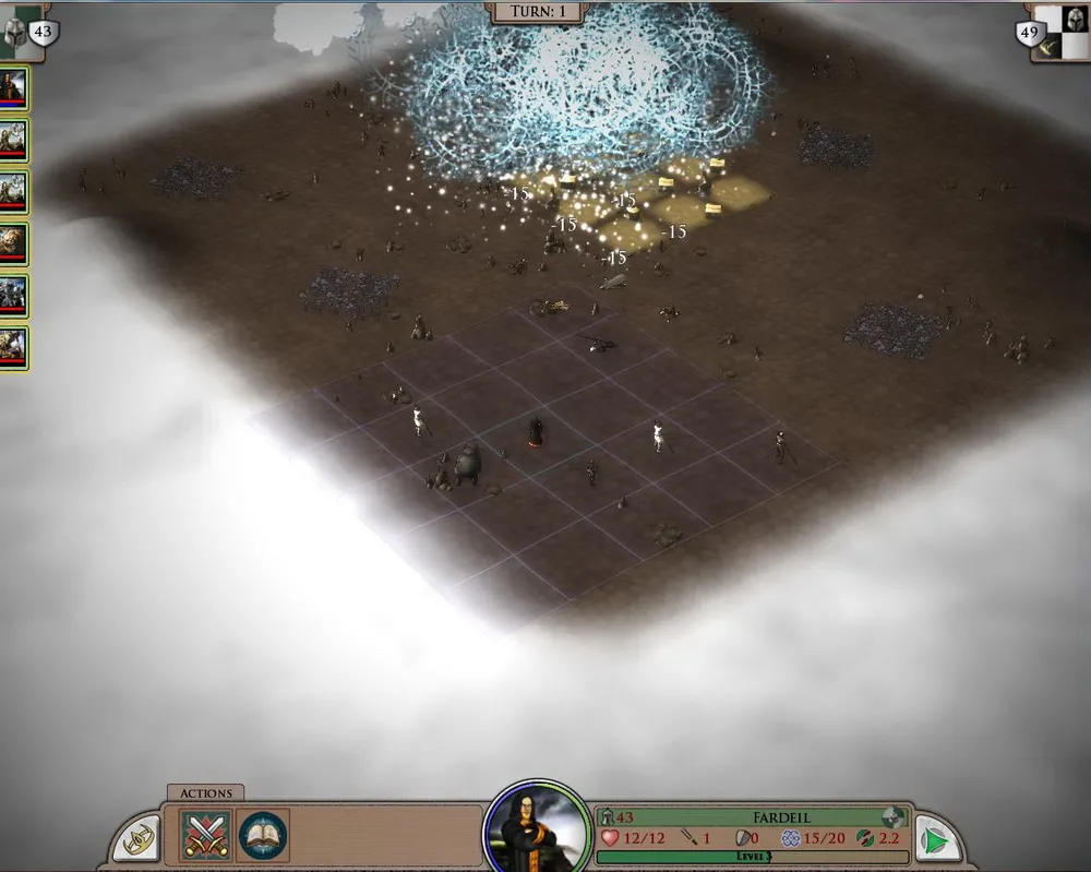 Далее у нас есть возможность убежать, нужно просто дойти до "святящегося дыма" в своем конце поля (так же скорей всего будут всякие штрафы по здоровью/количеству сумевших убежать бойцов). Вот тут видно лучше вроде, и еще увидите один из ранних спецэффектов заклинания Ice Bolt :)