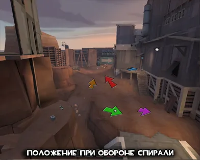 4. Вся оставшаяся команда (если есть убер/ медик) отходит к стрелке (В ином случае отходят дальше) и занимает места, показанные на картинке (син. и фиол. - скауты, коричн. - демо, зелён. - мед+солд, красн. - солд).