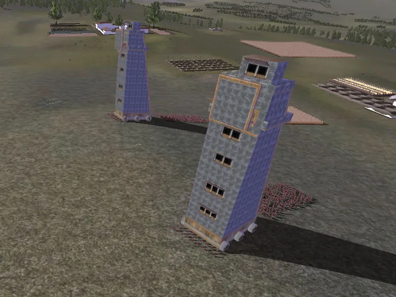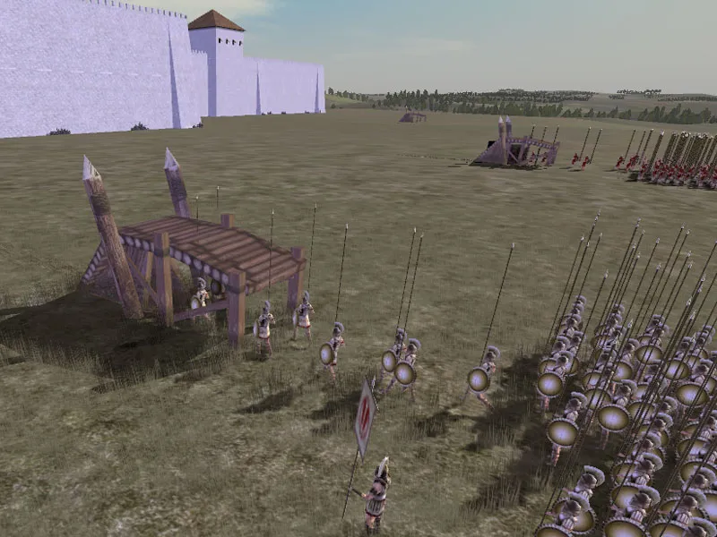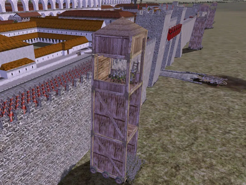 Использование осадных башен наносит меньше вреда инфраструктуре города. Но занимает намного больше времени. Да и шанс того, что штурм удастся, намного меньше, чем хотелось бы, но, иногда, за неимением катапульт, по началу игры, деваться особо некуда и приходится использовать именно такой способ. Тем более, что на деревянные стены даже жалко тратить драгоценный боезапас снарядов катапульт - они настолко слабые, что рушатся от 8-10 ударов тараном. Но всё же стоит опасаться маленьких башенок, которые могут нанести некоторый вред отрядам со слабой бронёй, и вражеских стреляющих юнитов – лучников и пельтастов, которые не примнут возможностью пострелять из-за укрытия и могут нанести очень неслабый вред вашей армии и сжечь все ваши осадные механизмы, что за неимением катапульт в армии, заставит вас уйти не солоно хлебавши. Чтобы этого избежать, нужно всего то пострелять в ответ и тогда вражеские стрелки скроются за городскими зданиями, не желая расставаться с жизнью.