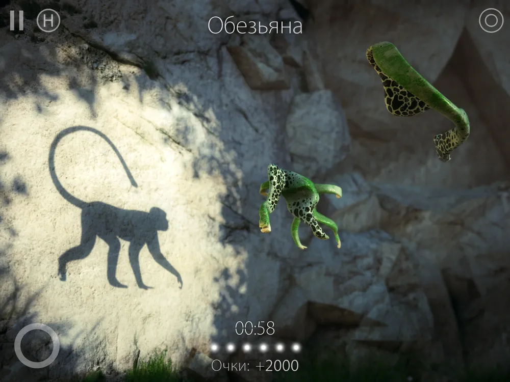 Если шкала прогресса не особо помогает в достижении цели, можно воспользоваться подсказками. Первая подсказка дает направление, в котором нам следует мыслить. Вторая закрепляет успех, подчас прямо намекая на то, что скрывается в тени. Третья показывает само слово целиком. Ну, а четвертая проецирует на экран устройства изображение, которое надо составить – нам лишь остается покрутить фигурки. Как правило, все становится понятно уже на второй подсказке. Хотя бывают и исключения. Вот что нелепо выглядит на суше, а еще пускает пузыри? Я долго пытался изобразить дельфина или какую-нибудь там медузу, но в итоге мы сошлись на аквалангисте.