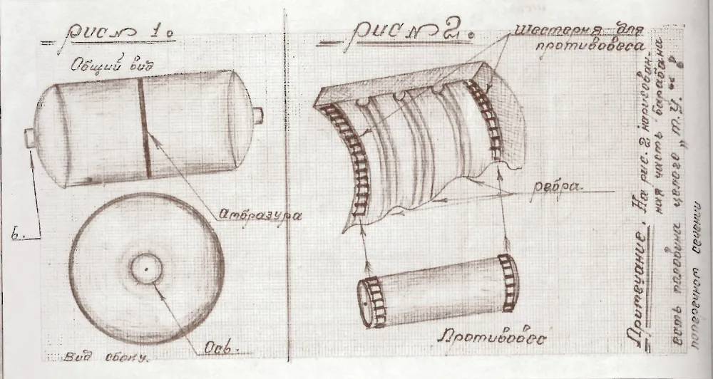 «Автор предлагает построить новый танк цилиндрической формы без гусениц. Движение танка осуществляется вращением внешних цилиндров. Габаритные размеры: диаметр цилиндров – 3000 мм, длина – 2500 мм, броня – 100 мм, экипаж 2 чел., вес – 50 тонн.