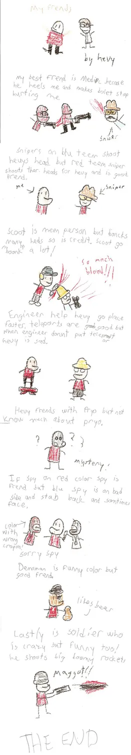Исковерканный синтаксис и искренний энтузиазм Heavy, очень сильно напоминает взгляды на мир пятилетнего ребенка. Очевидное вдохновение для этого рисунка - рисование его друзей и товарищей по команде.