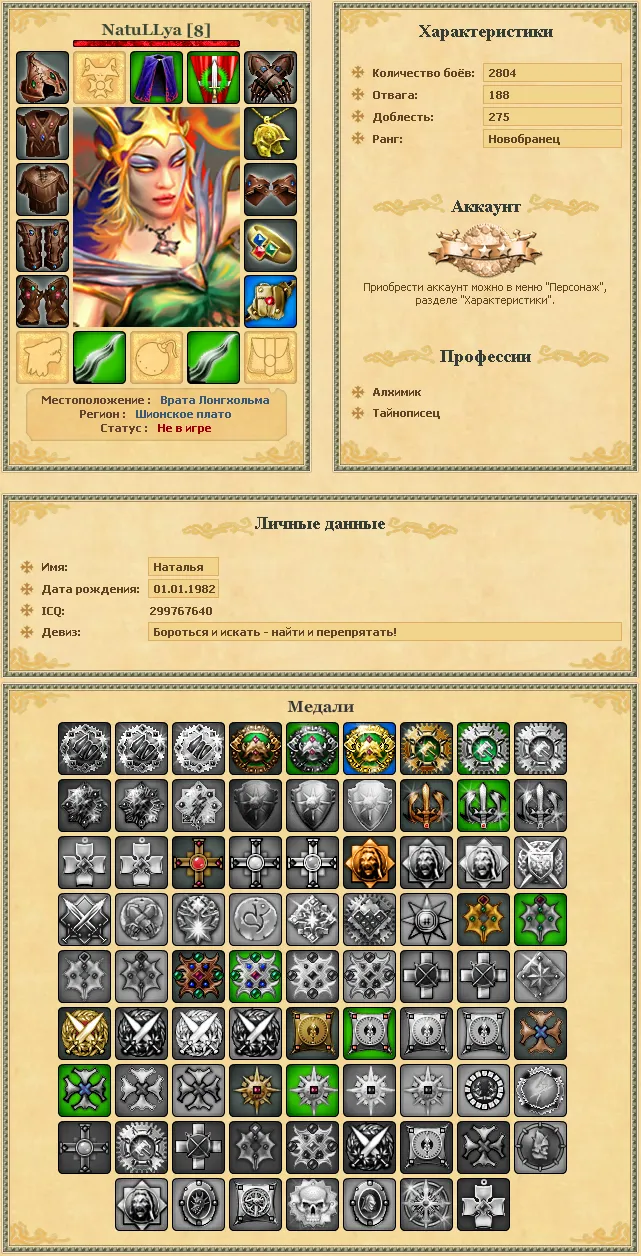 Красиво да? Это как раз те самые медальки... для получения одной из них потребуется в среднем от 200 до 1000 кликов: срабатываний пассивных эффектов\кастов заклинаний\прочитанных свитков\врагов убитых определенным ударом и выпитых эликсиров... Увы если вы хотите хоть чтото противопоставить противникам в ПвП - клики качать прийдется. Много. Очень и очень много. Потому как например на 8 уровне (середнячки игры - 8-10 лв) противопоставить что то прокачавшему клики противнику, не прокачавшись самому - невозможно. Ибо он убьет вас с 2-3 ударов без напряга. С уроном в 150-450 за ход (не прокачанная 8ка в ответ ударит на 10-30 урона). Вот такие пироги с котятами, их едят, а они мяукают. Заняться одним ПвЕ тоже не получится с 9го уровня появляются вещи требующие ранг в ПвП.., без которого вы становитесь даже не мясом, мошкой на 1 клик.