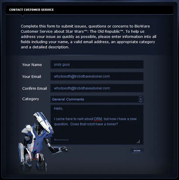 На Kotaku выложен скриншот формы техподдержки Star Wars: The Old Republic. Автор скриншота хотел задать Electronic Arts и BioWare серьезный вопрос о DRM, но забыл его, увидев оформление экрана. (Ключевая зона обведена кружком.)