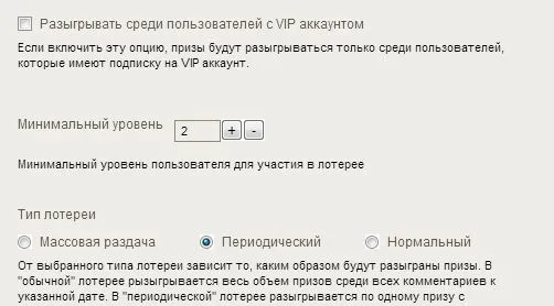 От выбранного типа лотереи зависит то, каким образом будут разыграны призы. В "нормальной" лотерее рызыгрывается весь объем призов среди всех комментариев к указанной дате. В "периодической" лотерее разыгрывается по одному призу с заданным интервалом до тех пор, пока не будут разыграны все призы. В "массовой раздаче" каждый комментатор будет получать приз, пока все призы не закончатся.